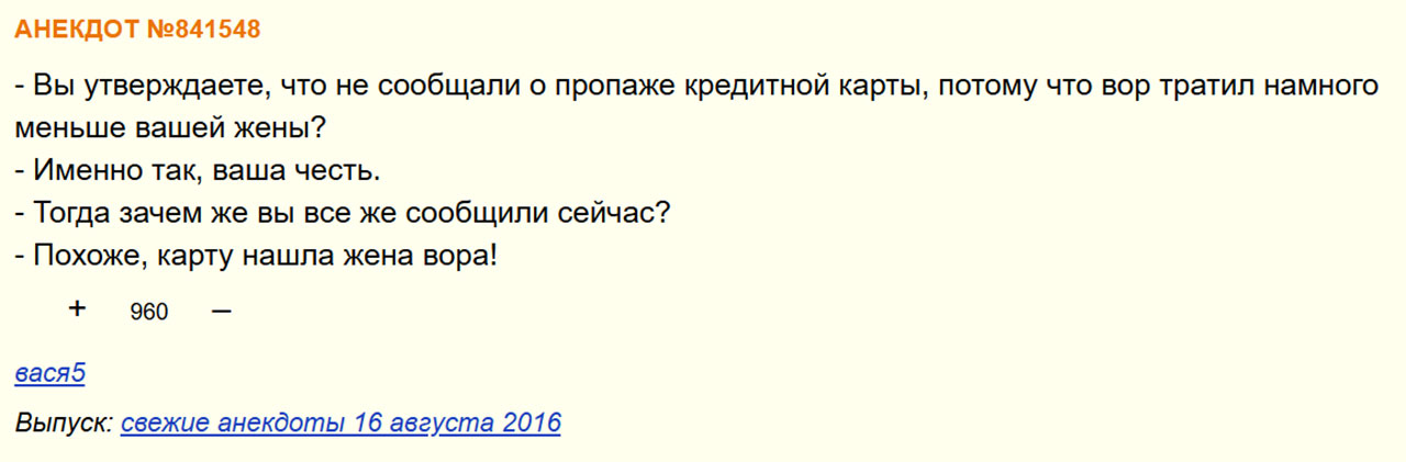 - Вы утверждаете, что не сообщали о использовании вашего анекдота, потому что вор тратил намного меньше вашей жены?