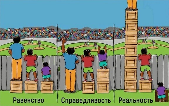 Будет более очевидно, если сравнивать не с футболом, а с базовыми потребностями. Нарисовать комнату заполненную водой и ящики, позволяющие дотянуться до воздуха. И всё равно найдутся те, которые скажут, что справедливо будет мелкому утонуть, раз он не делал работу, как остальные или не позаботился принести себе ящик.