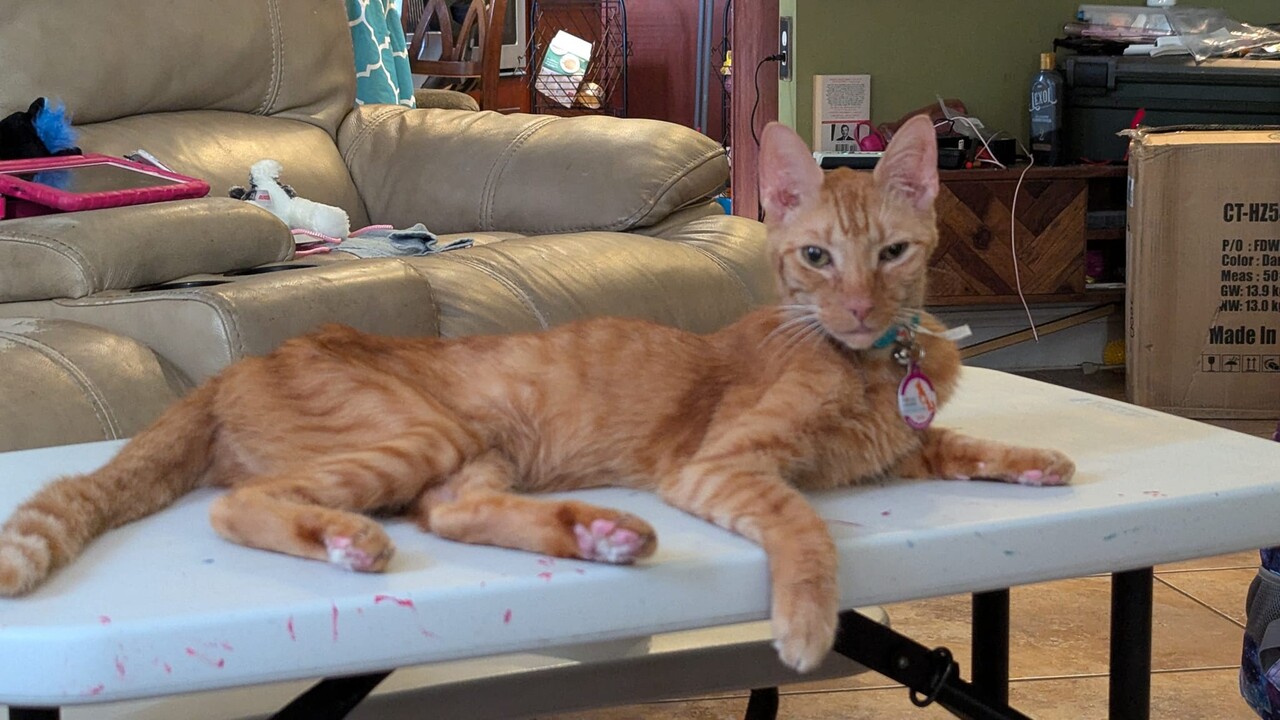 Мы последовали за ней в тихий уголок, где сидел худенький рыжий табби. Его золотистые глаза были полны грусти и тихого достоинства. Его звали Бэйби Бой — десятилетний бродячий кот, который выглядел так, словно когда-то у него был дом. Он был очень худым — при прикосновении чувствовался каждый выступ позвоночника, — но в его поведении было что-то по-настоящему королевское.