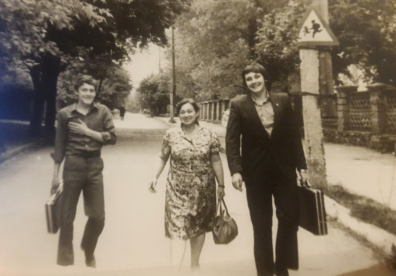 Интересно, что многие вспоминают, что именно физик или физичка были их самыми любимыми преподавателями в школе. Я не исключение. Причём, именно эта весёлая умная интеллигентная полная дама научила нас, десятиклассников, любить не только свой предмет, но ещё и литературу! Именно она (а не наша классная руководительница и филолог) заставила нас учить стихи Блока наизусть, которые я знаю до сих пор спустя 44 года. Это именно из-за Рахиль Хуновны я бросил Львовское военно-политическое училище и рванул домой в Кишинёв поступать на филфак университета, чтоб потом вернуться преподавать в свою родную 41-ю школу, мимо которой на этом фото идёт она, со своей фирменной улыбкой, а рядом с ней мои одноклассники Юра и Саша.