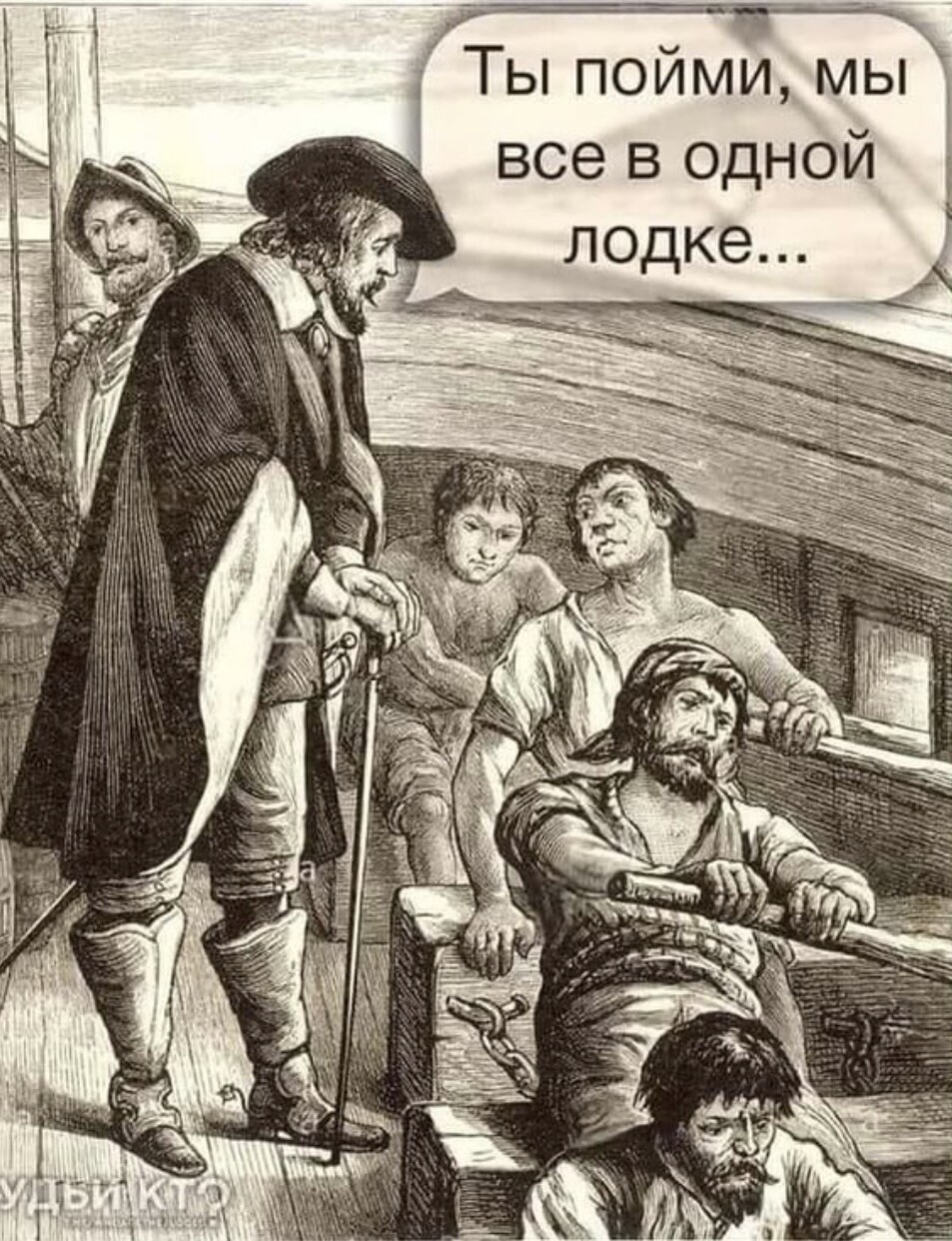 Каждый на своей лодочке.... втирает холопам, чтобы гребли усерднее и если потребуется - защищали свою лодочку от нападения других или были готовы взять другую на абордаж...