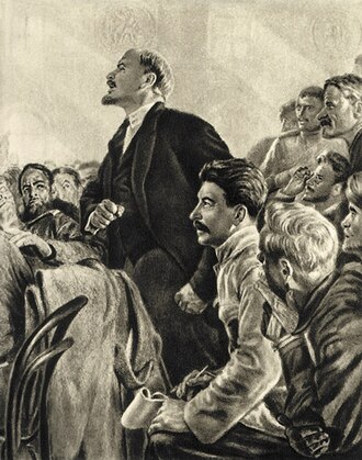 По прибытию селится в царских покоях на Финляндском вокзале. Публикует апрельские тезисы и выступает на митингах. Но недолго продлилась его революционная деятельность в городе Петрограде. Уже в конце июля соратники по партии решают, что ему лучше удалиться на время в Карельских скалах, изменив облик.