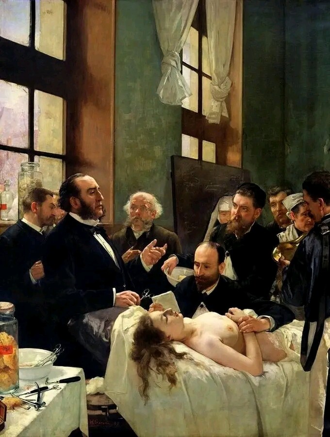 На переднем плане изображена ожидающая процедуры пациентка. Рядом с ней сидит ассистент профессора, контролирующий пульс. За спинами врачей видны фигуры фельдшериц. Поскольку XIX столетие было слабо знакомо с привычными современному человеку антисептическими мероприятиями, на холсте нет обязательных для этого случая перчаток, халатов и прочих элементов, обеспечивающих идеальную стерильность.