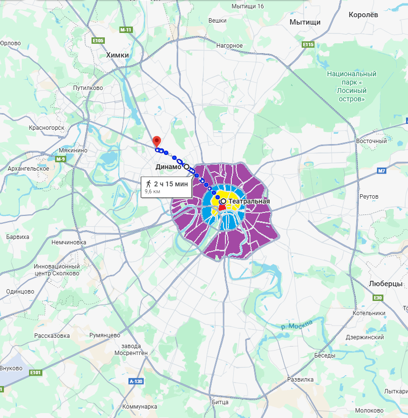 На приложенной карте вы можете увидеть маршрут от Театральной до Сокола. Красным цветом фона обозначен Кремль, жёлтым - Белый город (в рамках Бульварного кольца), голубым - Земляной город (в рамках Садового). Фиолетовый цвет - это внутренности Третьего кольца, то есть примерно город в течение 1805-1917 годов. Развилка, на которой заканчивается маршрут из синих точек - это м. Сокол, начало послевоенной застройки. А замкнутая автодорога а-ля "внешнее кольцо" - МКАД. То есть граница города до 1984-го года.