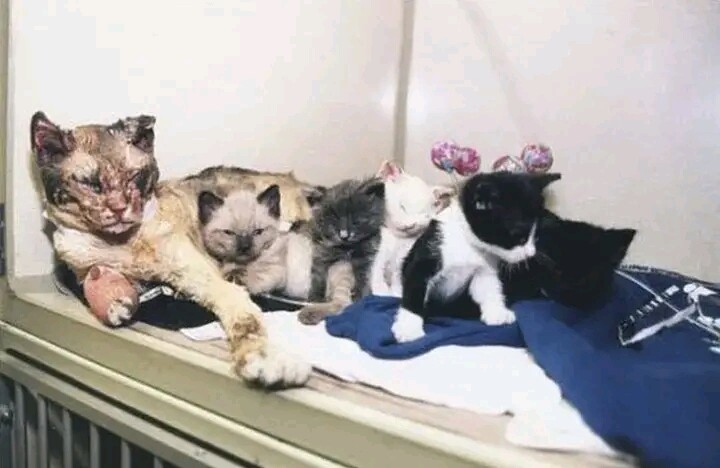 У кошки были обожжены уши и усы, обуглились подушечки лап, помутнела роговица глаз – но она кидалась в огонь пять раз подряд, пока последний, пятый котёнок не оказался в безопасности. И поступить как-то иначе не могла – в зубах умещался только один. Вынеся последнего, уже ничего не видя, она на ощупь убедилась, что все пятеро спасены (ткнувшись в каждого мордочкой) – и только после этого упала, потеряв сознание. Потрясённые такой самоотверженностью кошки пожарные оперативно отвезли кошку в ветклинику, где её спасли и выходили.