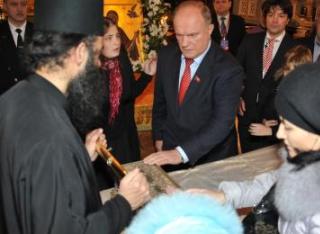 БОЖЬЯ МАТЕРЬ НА СЛУЖБЕ ЗЮГАНОВА В третьей декаде ноября 2011 г. по благословению новоизбранного патриарха Кирилла афонские монахи доставили самолетом в Москву пояс Пресвятой Богородицы (частицу). О его чудодейственных свойствах гости рассказывали так: он-де лечит бесплодие и помогает зачатию, если у мужа с женой «что-то не получается». ТВ-реклама заморской реликвии была столь оглушительной, что к ней в храм Христа Спасителя выстраивались многочасовые очереди. Туда ринулись не только молодые женщины фертильного возраста, но и 70-летние бабушки и дедушки. Со своей свитой в храм с «черного хода» пожаловал и бессменный предводитель КПРФ и ее думской фракции Геннадий Зюганов. Он-то кого-чего хотел «родить»? На другой день на сайте партии появилась вот эта запись: «25 ноября Председатель ЦК КПРФ Геннадий Зюганов приложился к святыне Православного мира - Поясу Богородицы, пребывающем в Храме Христа Спасителя. Получив благодать от этой православной реликвии, Геннадий Зюганов как лидер крупнейшей оппозиционной партии страны - партии всего народа - готов с верой и решительно завершить предвыборную кампанию КПРФ и выполнить предвыборные обещания партии, всех народно-патриотических сил перед избирателями, гражданами страны. С помощью Богородицы - заступницы и покровительницы России - это будет сделать легче». Таким образом, «главный коммунист России» хотел поставить на службу своим предвыборным интересам и Божью Матерь. Но это не возымело. На президентских выборах 4 марта 2012 г. победил беспартийный В.В.Путин.
